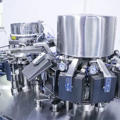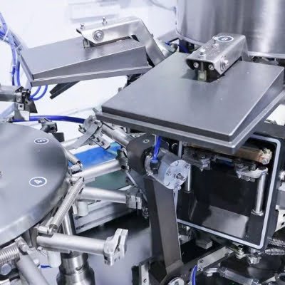 The rotary vacuum premade pouch packer features two rotating tables. The first is used for loading the pouches, while the second has a vacuum chamber to ensure a tight seal.